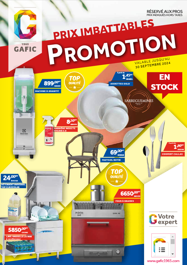 Découvrez ci-dessous notre catalogue promotionnel général GAFIC (prix valables jusqu'au 30 septembre 2024).